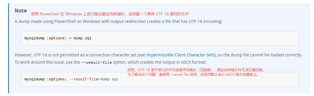 因此,即使我们在 mysqldump 命令中指定了 UTF-8 编码格式,但其作用范围也只去到该命令的执行完成。在重定向输出时,Windows PowerShell 会自动的将 mysqldump 命令的 UTF-8 结果转换成 UTF-16 格式输出,最终导致编码异常,乱码。