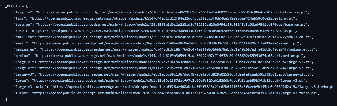 Whisper 目前主要推出了 tiny、base、small、medium、larg 这几类大模型,在 Whisper 运行时,这些模型会自动下载。
