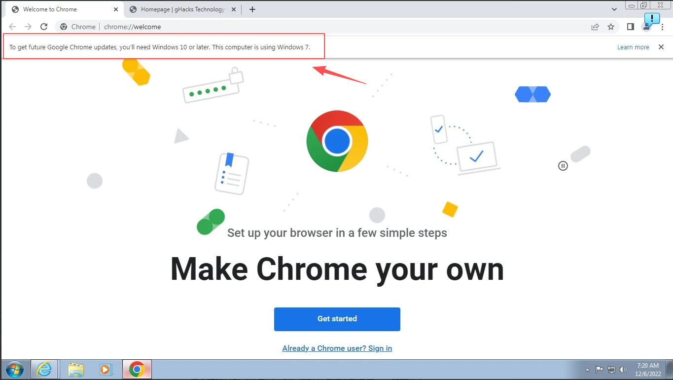 用户如果在 Windows7 系统上安装 Google Chrome,在打开浏览器时,浏览器头部会弹出如下的系统升级提示:想要获得后续谷歌 Chrome 更新,你需要升级到 Win10 或者更高版本。当前设备运行的是 Win7 系统。