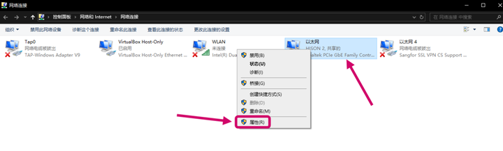 - 右键 > 属性 > 共享 > 允许其他用户通过此连接(网络填虚拟网卡名称)