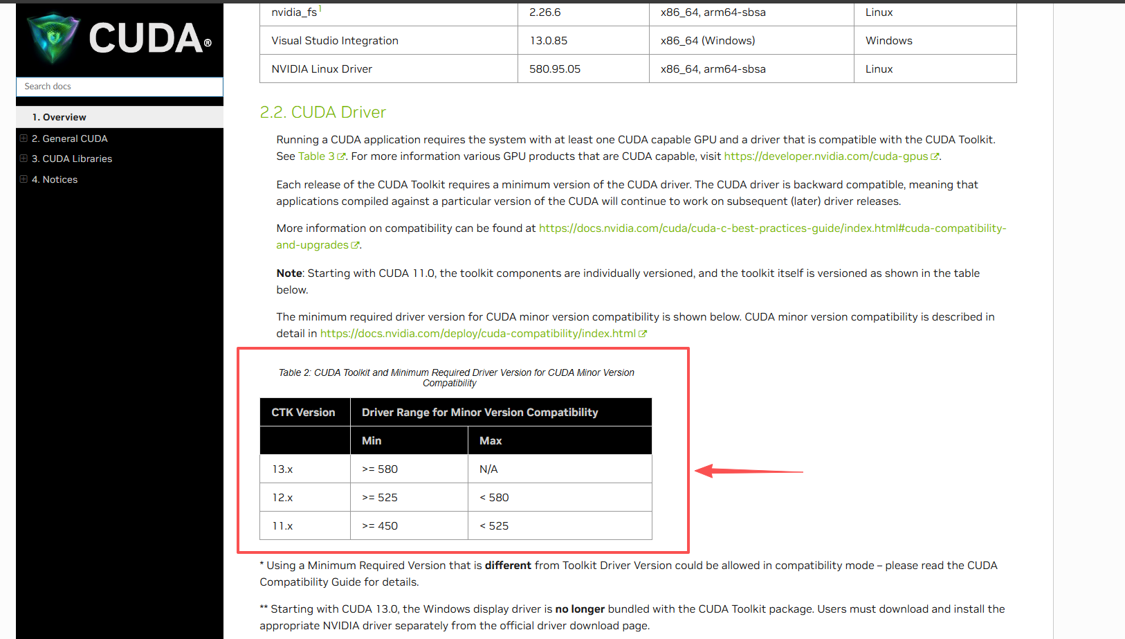 对应版本 CUDA 所支持的最低驱动可以通过 NVIDIA 官网文档查找: