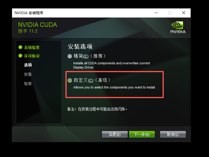 安装过程中,推荐使用自定义安装,仅勾选 CUDA 项。