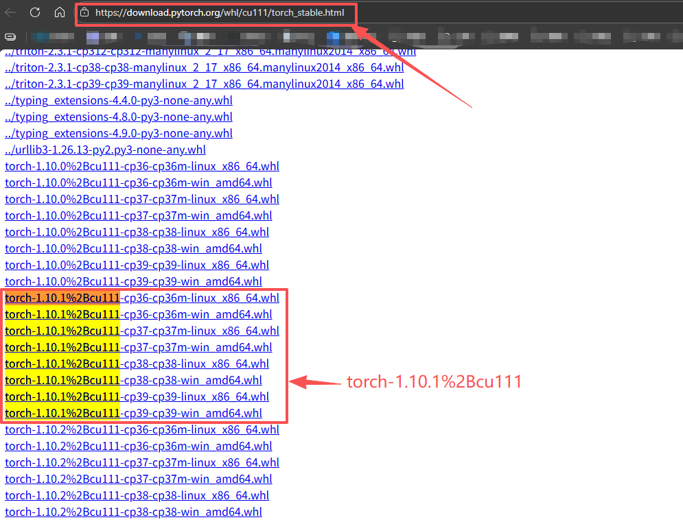 参数 -f https://download.pytorch.org/whl/cu111/torch_stable.html 指示了下载地址,开发者可通过访问这个地址来寻找需要的软件包,并点击下载。