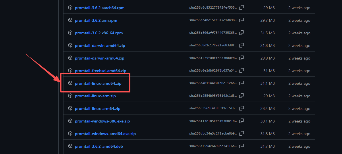 Promtail 的仓库与 Loki 是同一个,因此可以前往: Loki Releases 进行下载,比如: promtail-linux-amd64.zip