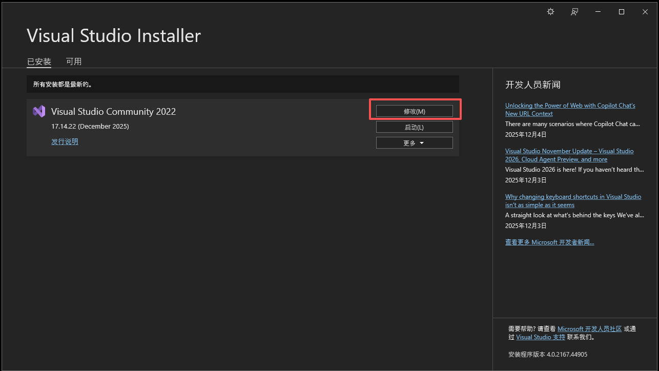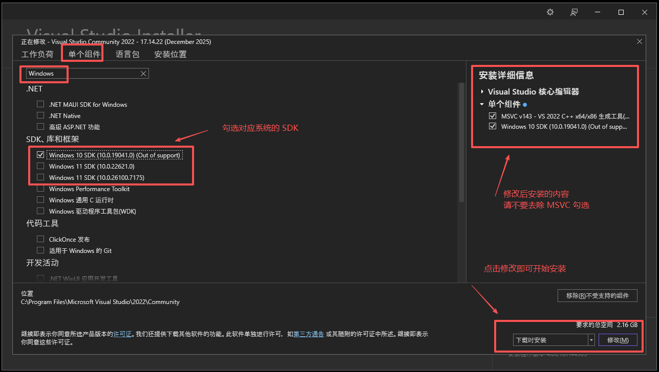 解决方法:通过 Visual Studio Installer 修改 Visual Studio 安装内容,添加 Windows SDK 安装。