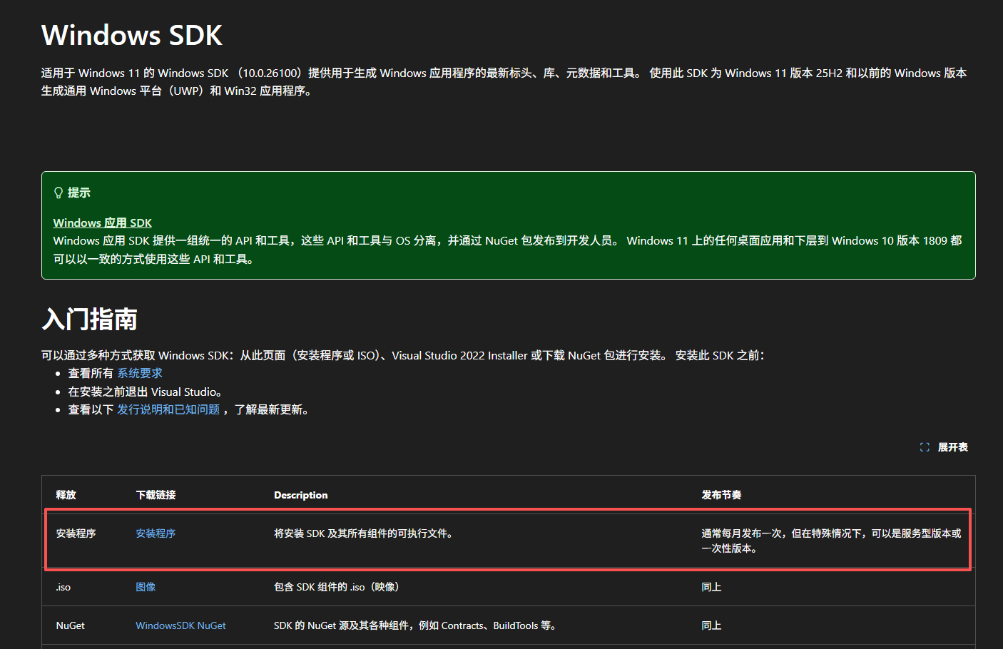 或通过 Windows SDK 官方网站手动下载安装包进行部署: Windows SDK