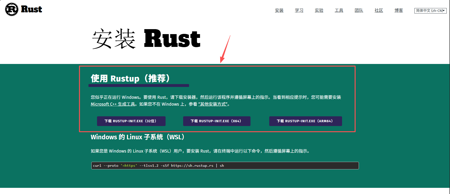 前往 Rust 官网下载页 Install Rust ,按设备型号选择下载相应的安装工具。