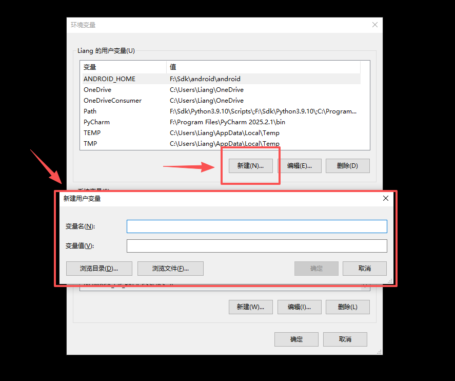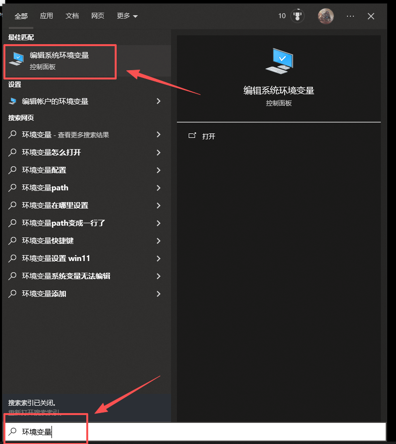 Windows 系统可以通过按下 Win + S 快捷键打开搜索,输入环境变量来跳转到设置弹窗,完成上述配置。