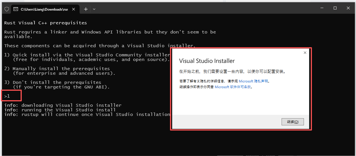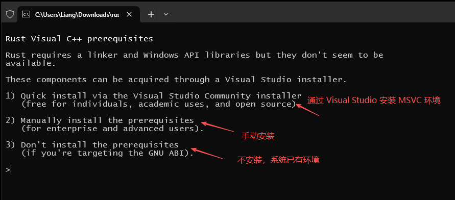 rustup 的安装需要设备具有 MSVC 环境,因此在启动程序后,会要求用户选择是否安装 MSVC。