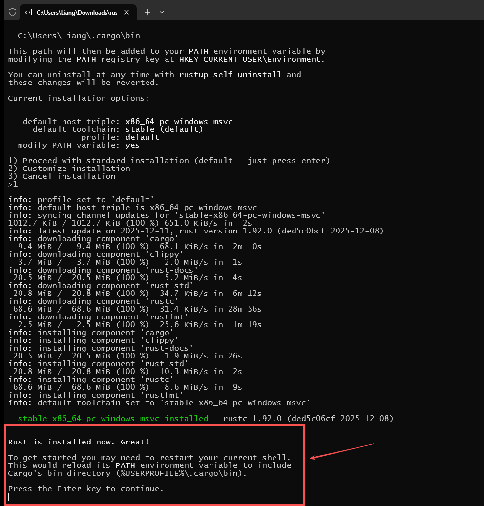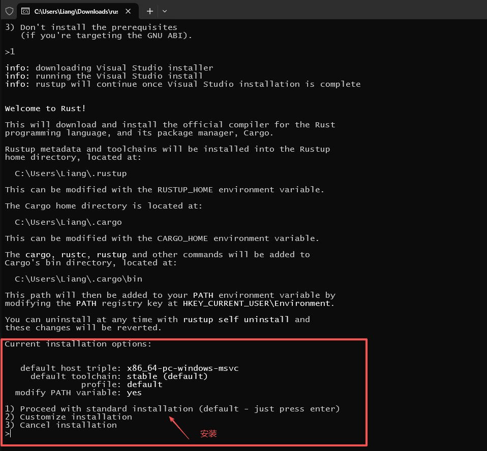 在上述程序安装完成后,rustup-init.exe 会自动进行下一步,正式开始安装 rust。
