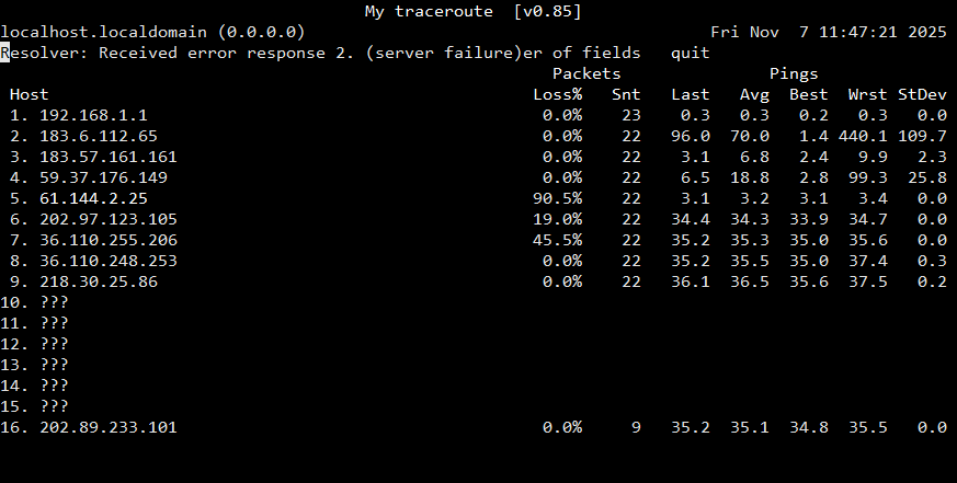 MTR(My traceroute)是大部分 Linux 发行版本预装的网络测试工具,它将 ping 和 traceroute 命令合并到同一个工具中。